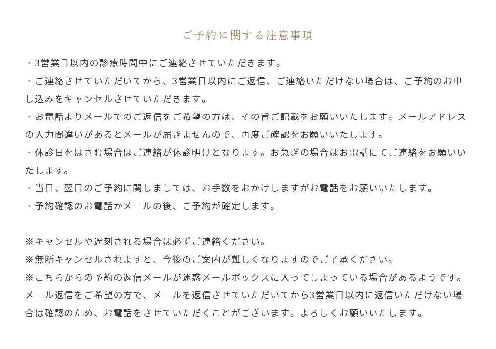 ※やむを得ない事情で遅刻・キャンセルされる場合も必ずご連絡いただきますよう、よろしくお願いいたします。